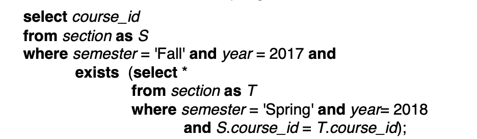 위 식은 이중 for문과 유사하다고 보면 된다. S의 행 하나에 대해 하위 쿼리문에서 T값을 바꿔가며 테스트하고, 하나라도 일치하면 true를 반환한다.