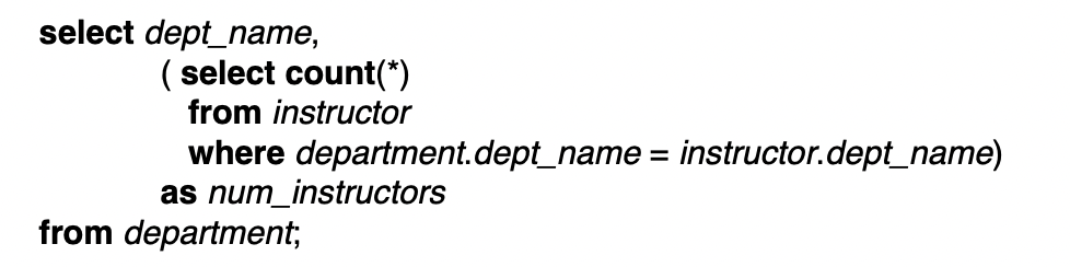 각 학생의 tot_cred 속성을 지금까지 이수한 수업의 학점의 합으로 설정한다고 가정했을 때, scalar subquery가 유용하게 쓰인다.