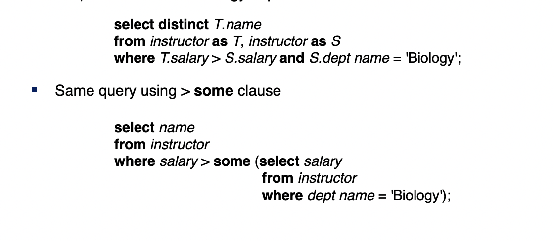 Set Comparison은 some, all 연산자를 통해 서브쿼리 결과의 릴레이션과 바깥 쿼리를 비교하는 것이다. 아래 두개는 같은 결과를 반환한다.