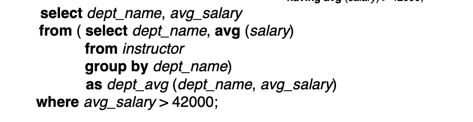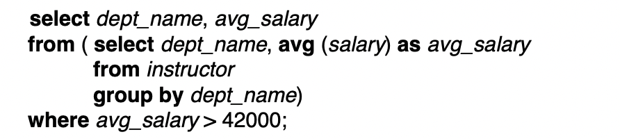 "평균 급여가 42000 이상인 학과 교수들의 평균 급여를 구하라"일 때, having 절을 이용해서 구할 수도 있지만,