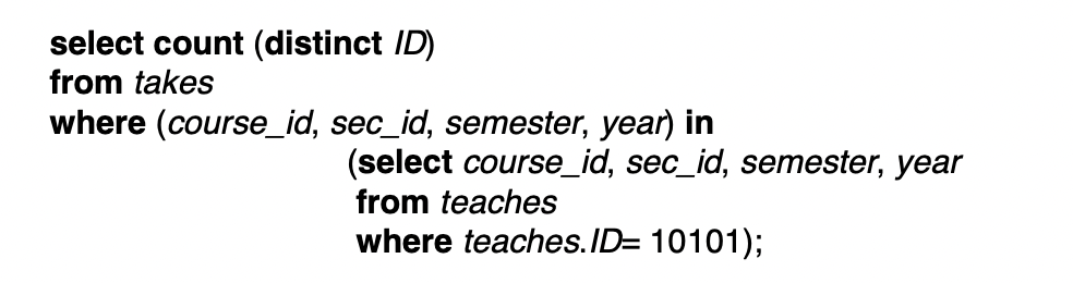 하나의 쿼리 안에 또다른 쿼리 (select-from-where)이 있는 것을 의미한다. 보통 where 절에서 하위 쿼리를 중첩시킴으로써 집합에 속해있는지를 테스트하고, 비교나 원소 개수를 결정하는 데에 사용된다.