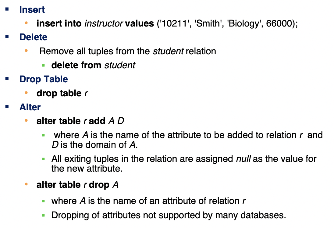 릴레이션을 제거할 때 drop table 명령을 쓴다. delete from table보다 더 강한 명령어인 것이, delete는 릴레이션은 남아있지만 모든 튜플들을 제거한다면, drop은 릴레이션 스키마까지 모드 지우기 때문에, create table을 하지 않는 이상 해당 릴레이션을 사용할 수 없다. alter은 이미 존재하는 릴레이션에 속성을 추가하거나 제거할 때 사용한다. 새로운 속성을 넣으면 모든 튜플에 대해 일단 null로 할당이 이루어진다.