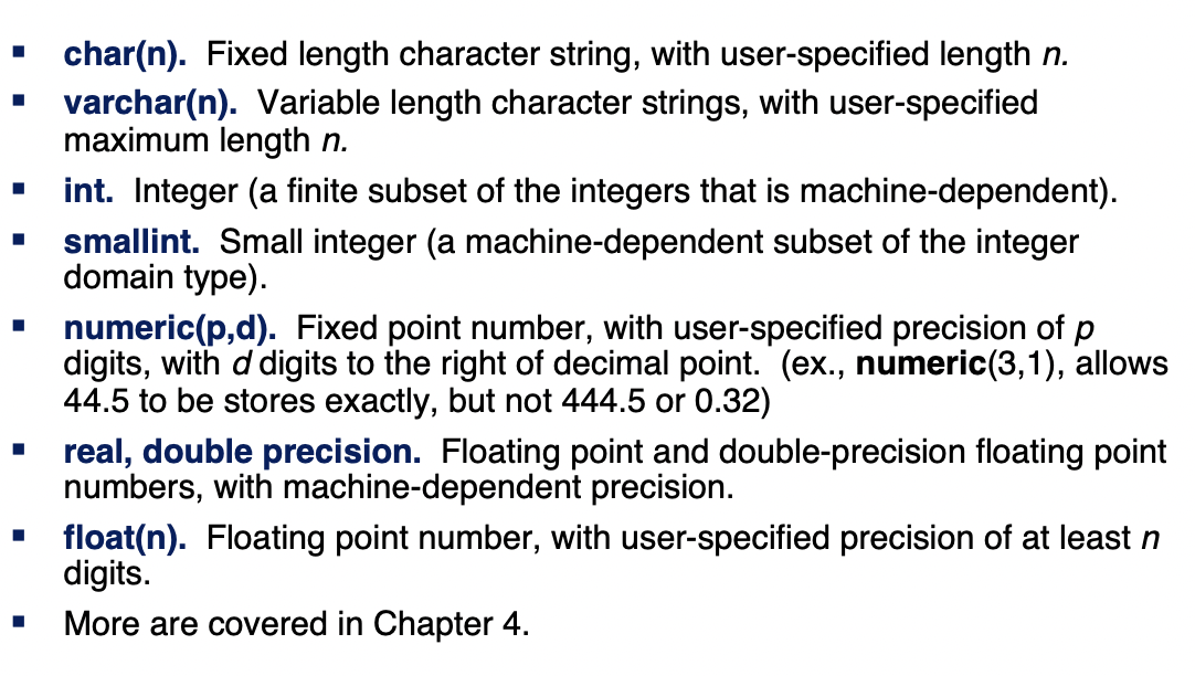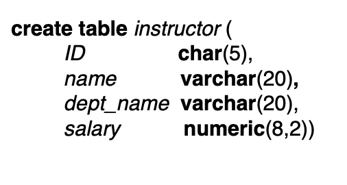 DDL(Data Definition Language) : 데이터베이스의 구조를 정의한다. 릴레이션의 스키마, 무결성 제약 조건(integrity), 관련 속성들의 타입, 뷰(View), 액세스 권한, 물리적 저장 구조 등을 정의한다. 릴레이션 삭제/수정하는 기능도 제공한다.
