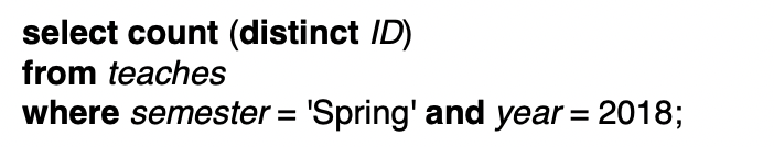 Aggregate Function은 입력으로 집합을 가지며, 출력으로는 단일값을 갖는다. 보통 다음과 같은 내장 함수가 있다.