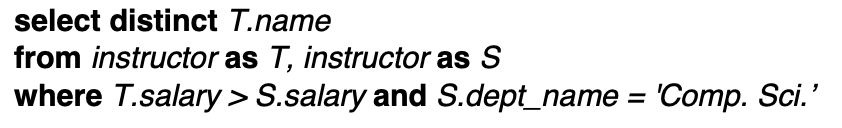 이러한 식으로 한 테이블 안에서 비교할 때 T, S라는 이름을 주어 비교할 수 있다. as를 생략해도 똑같이 작동한다. 긴 이름의 릴레이션을 짧게 바꿀 수 있으므로 효과적이다.
