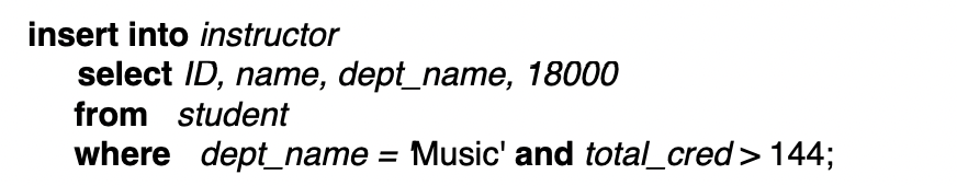 질의의 결과를 튜플로 삽입할 수도 있다. 예를 들어, 음악학과에서 144학점을 넘어가는 학생에 대해서만 넣을 수도 있다.
