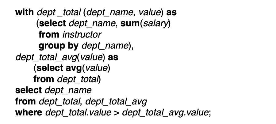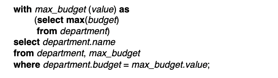 with clause는 with를 사용한 쿼리에서만 유효한 임시 릴레이션을 제공한다. 그 당시에만 동적으로 생성되었다가 지워진다.