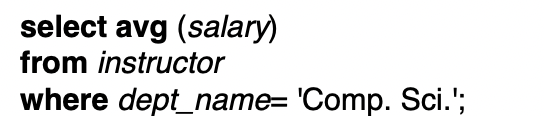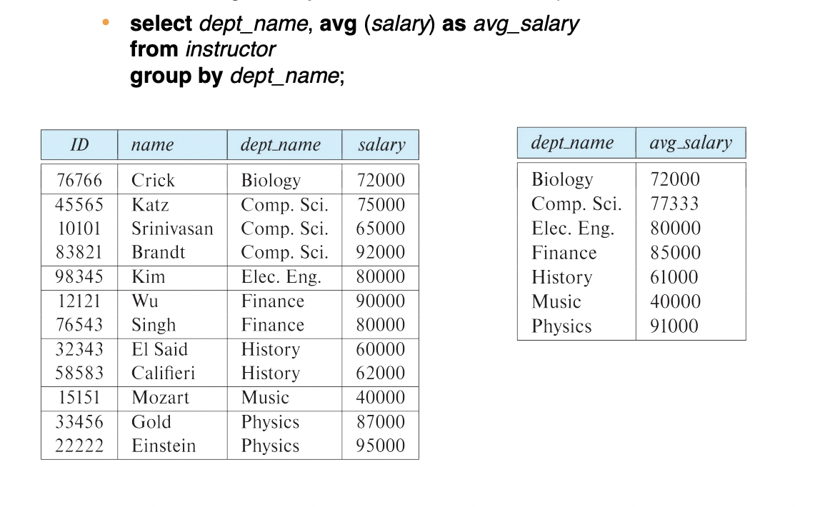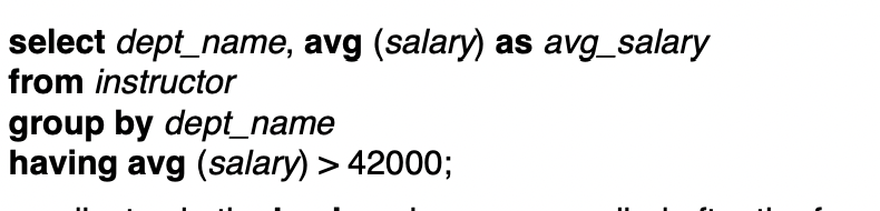 여러 튜플 집합으로 나누어 각각의 결과를 알고 싶을 때 사용한다. 예를 들어 각 학과의 봉급 평균을 알고 싶다면, 학과이름대로 group을 만들고, 그 내부에서 avg(salary)를 적용할 수 있다. 결과는 다음과 같다.