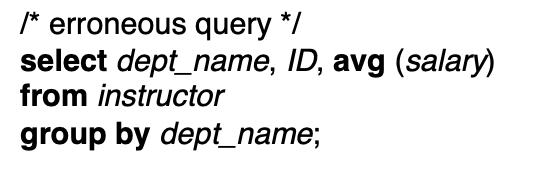 당연한 말이지만, select에서 aggregation function없이 쓰는 속성은 무조건 group by 속성과 같아야 한다. 아래 예시와 같은 경우