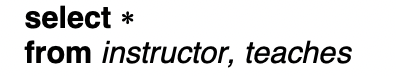from에 여러 relation을 넣으면 두 table에 대한 Cartesion product를 하라는 의미이다. 다른 테이블에 같은 이름의 속성이 있을 경우에는, (예를 들어 instructor에도 ID, teaches에도 ID가 있을 경우) 결과 table에서는 instructor.ID, teaches.ID와 같은 형식으로 나온다.