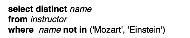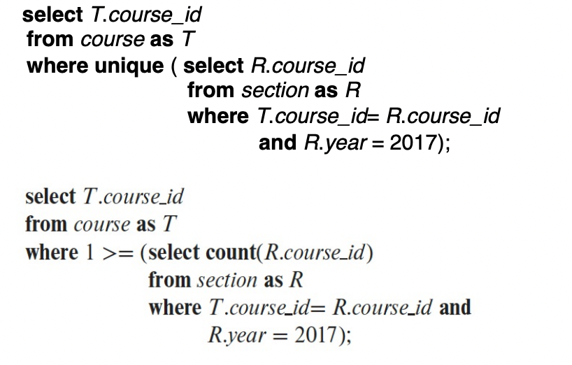 unique : subquery의 결과가 중복된 튜플을 가지는지 확인할 수 있다. 중복된 결과를 가지지 않으면 true를 반환한다. 결과가 빈 집합이어도 true로 반환된다고 한다.