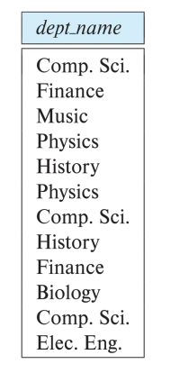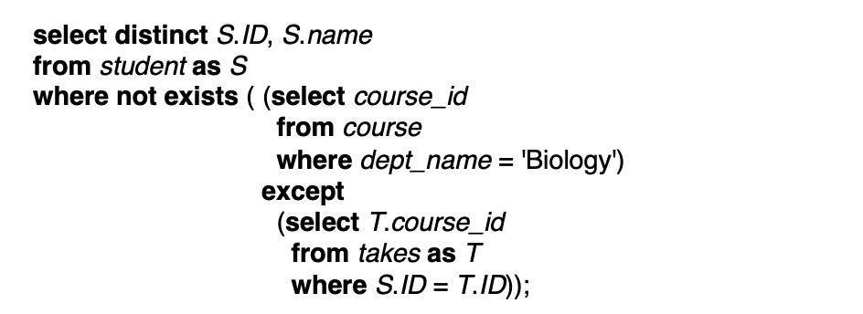 union, intersect, except를 통해 relaional algebra에서 합집합, 교집합, 차집합과 같은 연산을 할 수 있다. union은 두 테이블을 합치고, intersect는 둘다 참인 경우만 합치며, except는 첫번째 결과에서 두번째 결과를 제외한다.