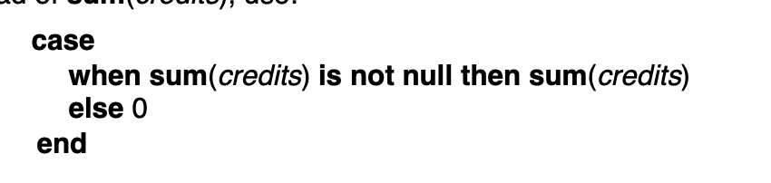 여기서는 학점이 F, null이 아니면 이수를 했다고 가정한다. 학생 릴레이션 모든 토플에 대해 takes와 course를 join해서 다음 조건을 만족하는 경우의 학점의 총합을 구하도록 한다.