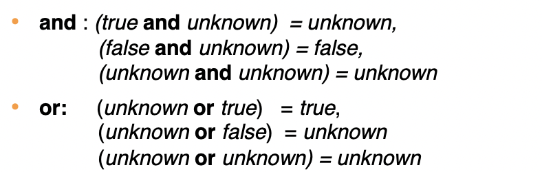 null 관련 비교 연산은 보통 unknown값이 되는데, and와 or 연산자를 사용할 경우 true/false값이 결정될 수도 있다.