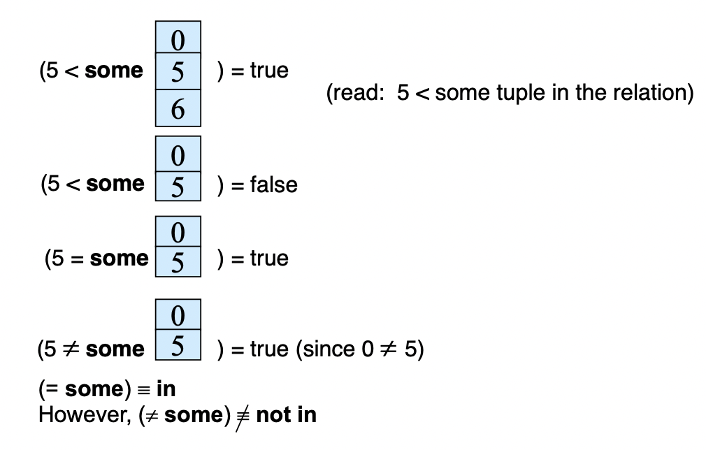some: subquery의 결과 중 하나라도 조건을 만족시키는게 있다면 해당 튜플을 참으로 판단