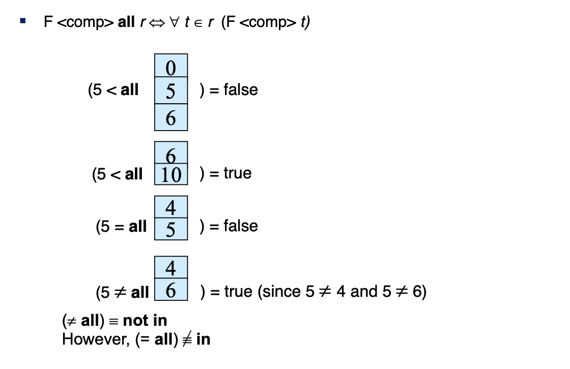 all: subquery의 결과 모두와 비교했을 때, 항상 참이어야 해당 튜플을 참으로 판단