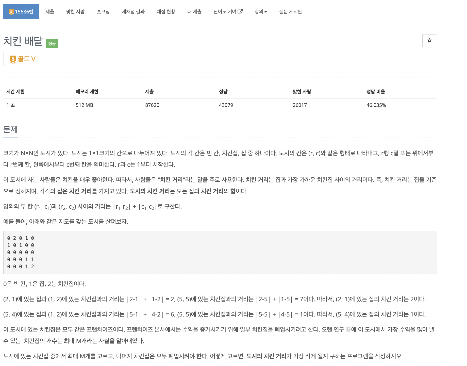 크기가 N×N인 도시가 있다. 도시는 1×1크기의 칸으로 나누어져 있다. 도시의 각 칸은 빈 칸, 치킨집, 집 중 하나이다. 도시의 칸은 (r, c)와 같은 형태로 나타내고, r행 c열 또는 위에서부터 r번째 칸