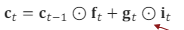 위 식을 풀어서 설명하자면, 이전 값(ct-1)을 얼마나 잊을지(f), 이번에 들어온 입력값(i)을 얼마나 기억할지(g)를 구하고 이 둘을 더하는 것이다.