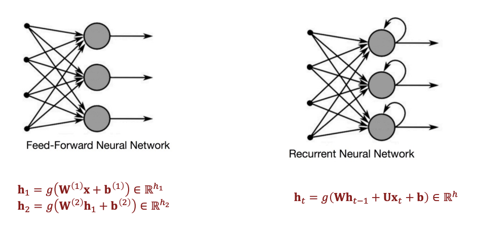 - RNN은 과거 정보(V)와 현재 정보(U)를 모두 반영 : 은닉층의 결과를 출력층에도 보내고, 그 다음 시퀀스의 은닉층으로도 보내면서 과거 정보를 잃지 않도록 해준다. 이렇게 함으로써 자동으로 순서 정보가 저장된다.