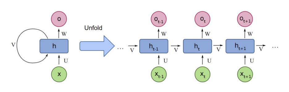 보통 왼쪽 이미지가 RNN을 검색했을 때 나오는 일반적인 자료인데, 이를 펼치면 오른쪽과 같은 이미지이다. 이 이미지에 대한 설명은 아래와 같다.