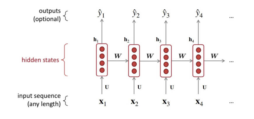 RNN의 핵심 아이디어는 동일한 가중치를 시퀀스의 다양한 위치에서 반복적으로 적용하는 것이다. (가중치 공유)