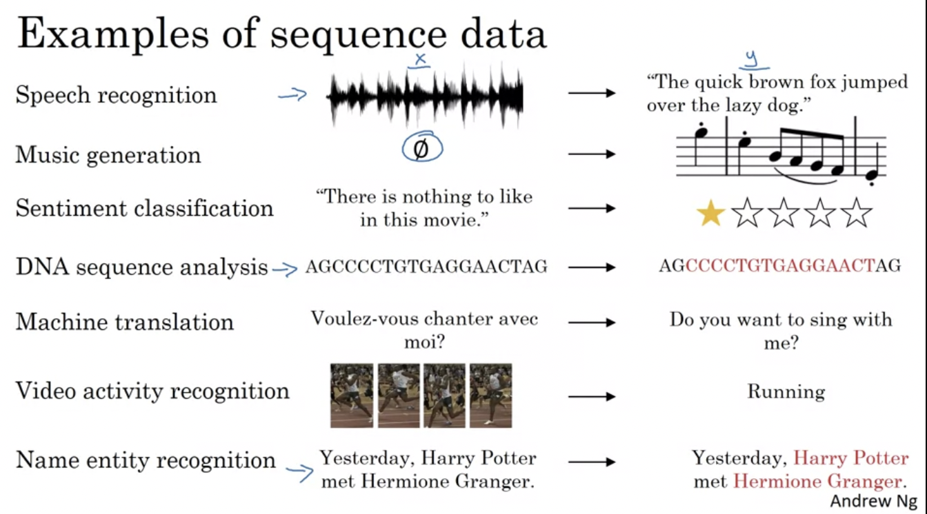 (참고) Sequence data와 관련된 NLP task 활용 예시는 다음과 같다.