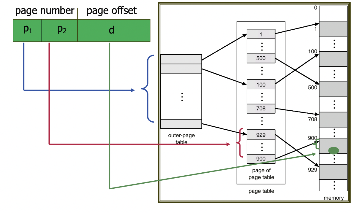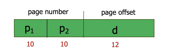 여기서 p1은 outer page table의 인덱스이고, p2는 해당 inner page, 즉 page table내부의 displacement를 나타낸다.