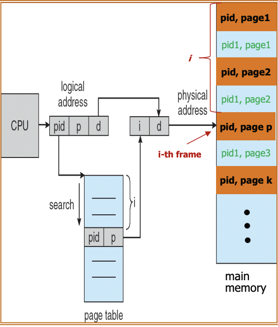 프로세스별로 Page table이 따로 있는 것이 아니라, 요소에 pid를 추가하여 하나의 Page table만을 이용한다. 각 entry(항목)들은 memory의 한 frame을 가리킨다. 페이지 테이블을 줄일 수 있지만, pid도 검사해야 해서 search time이 증가한다. 이 문제를 해결하기 위해 hash table을 이용할 수도 있다.