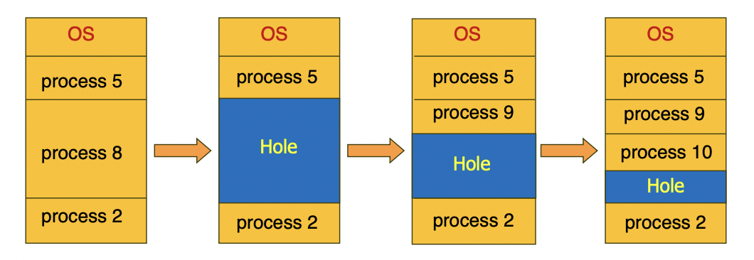 3. Multiple-partition allocation (variable size): 프로세스 크기만큼의 가변적인 크기로 분할한다. 그런데 그중 하나의 프로세스가 끝나면 Hole이 발생한다. Hole은 위 아래와 같이 이용가능한 메모리의 block을 의미한다. process가 도착하면 process가 할당될 수 있을만한 크기의 Hole을 찾아 할당한다. 보통 운영체제는 allocated partions와 free partitions(free)에 대한 정보를 계속해서 갖고 있다.