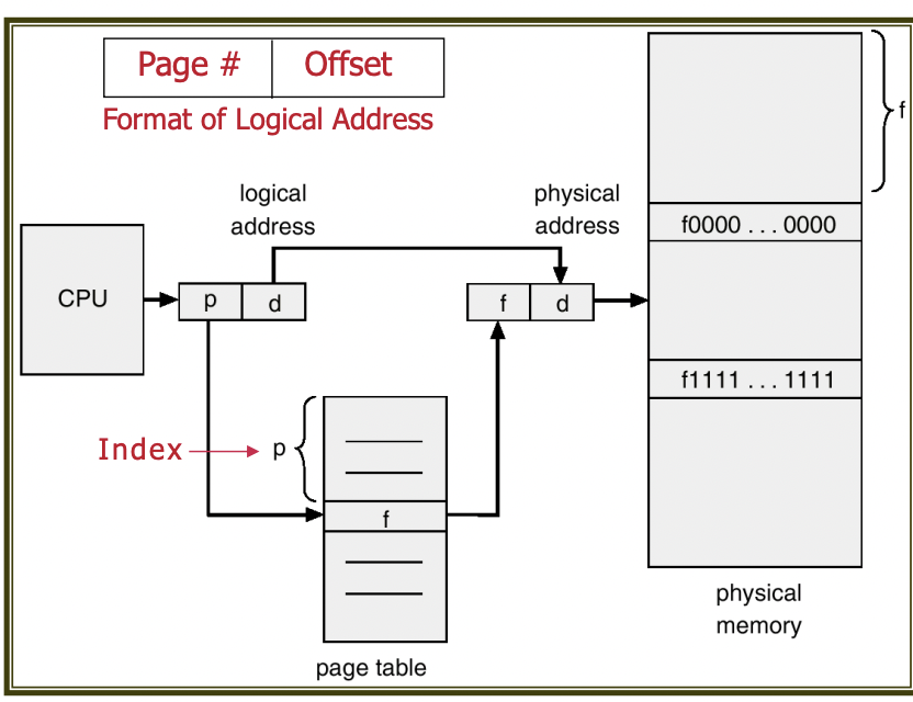 ㅍpage number(p): page table에서 page의 인덱스로 사용된다. 각 페이지 별로 physical memory의 base address(시작 주소)를 가지고 있다. logical address에서 page size를 나눈 몫