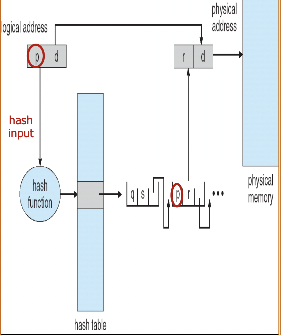 보통 주소공간이 32bit보다 클 때 많이 쓴다. 해시 페이지 테이블의 각 항목은 연결리스트로 이루어져있다. 해시 페이지 테이블에는 virtual page number인 p가 포함되어 있다. 각 해시 원소는 virtual page number과 매핑될 page frame number, 다음 포인터를 가지고 있다.