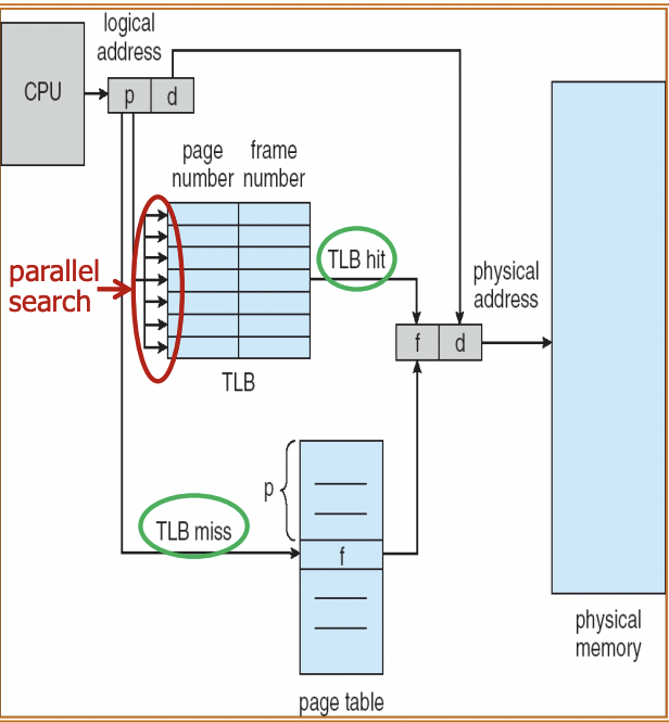: page numbr와 frame number 사이에 병렬 탐색 (parallel search)을 하며 address translation을 수행한다. TLB는 일종의 cache와 같은 것으로, 자주 쓰이는 page들만 담겨있다.