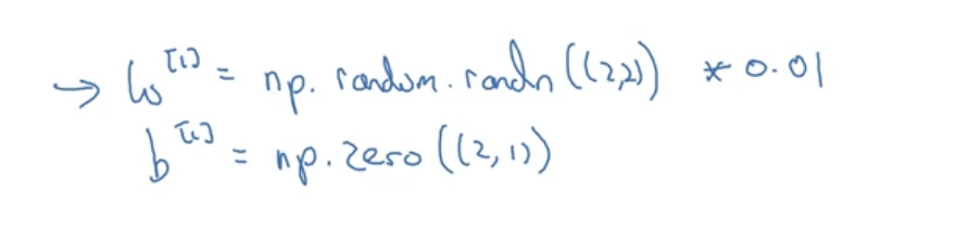 보통 작은 값으로 만들기 위해 np.random을 한 후 매우 작은 값을 곱한다. b는 0으로 초기화해도 상관없다는 사실이 밝혀졌기 때문에 그냥 0으로 초기화해도 괜찮다.