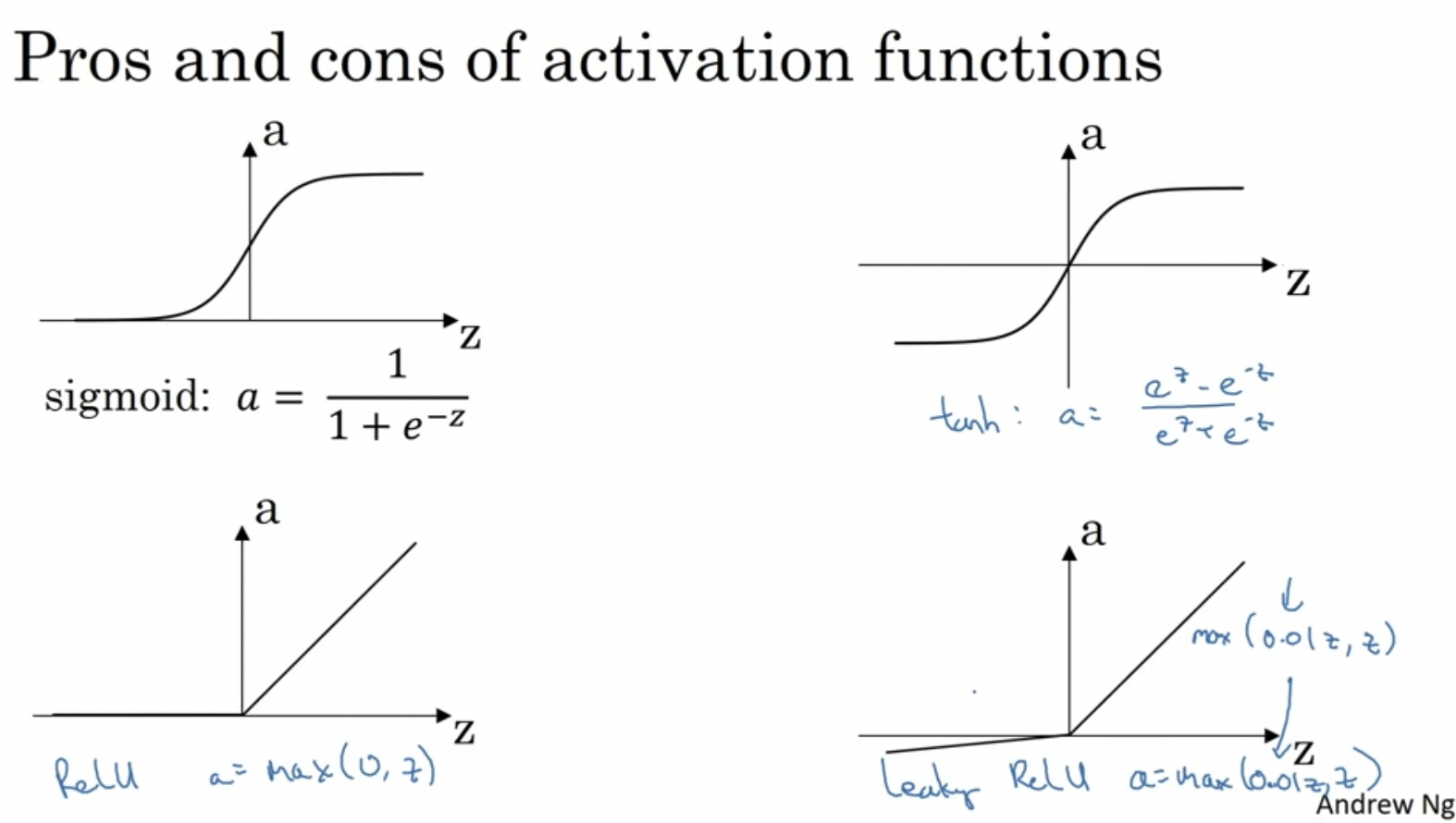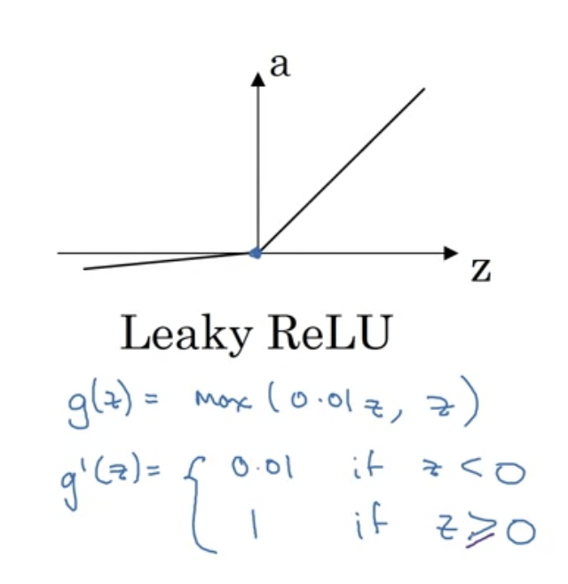 *leakly ReLU : z가 음수일 때 0이 아니라 아주 작은 값을 주는 함수이다. ReLU의 변형버전