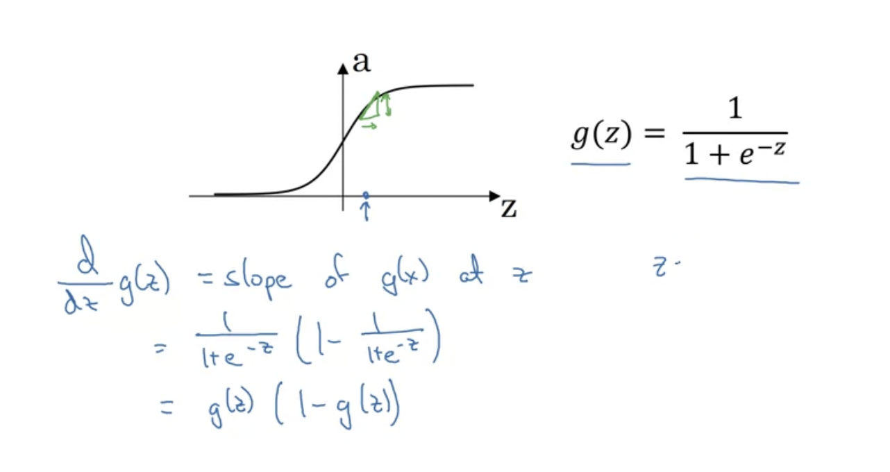 우리가 잘 아는 시그모이드 함수 g(z)의 기울기를 구하면 g(z)(1 - g(z)가 나온다.