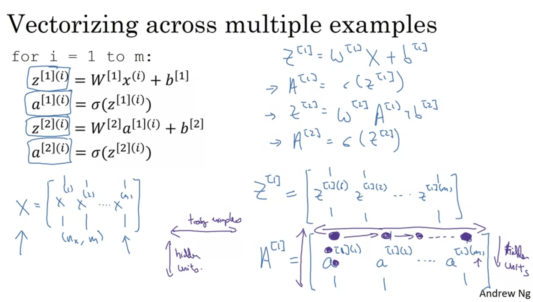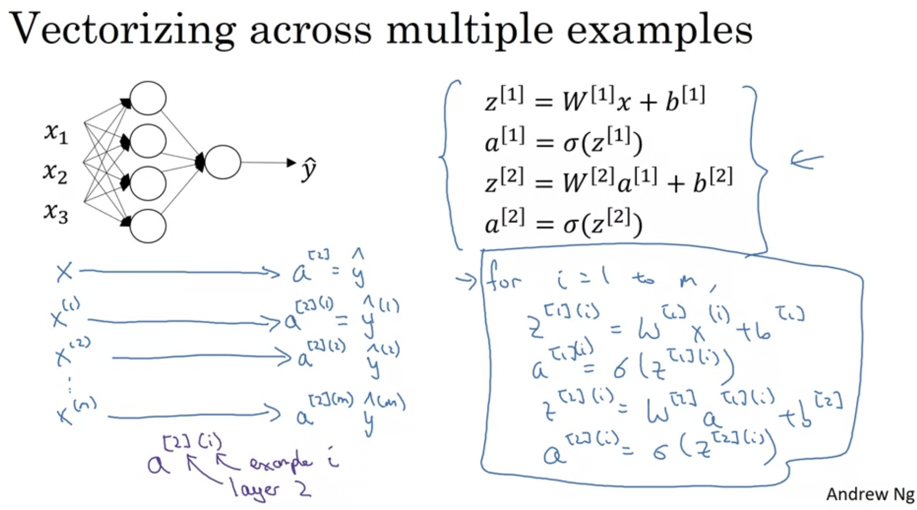 sing input feature vector a가 들어갔을 때, 뉴럴 네트워크에서 어떻게 계산되는지를 살펴보았다. training example을 stacking함으로써 한번에 계산할 수 있다.