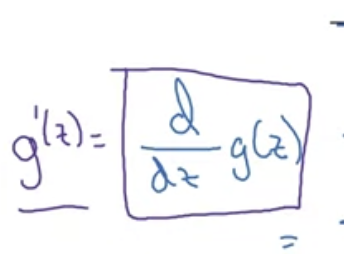 g(z)를 a로 보면, 도함수는 a(1-a)이다. 이것의 장점은, 이미 g(z)에 대하여 계산을 마쳤을 경우 (마친 다음 a로 저장하였을 경우) 도함수도 매우 빠르게 계산이 가능하다는 것이다.