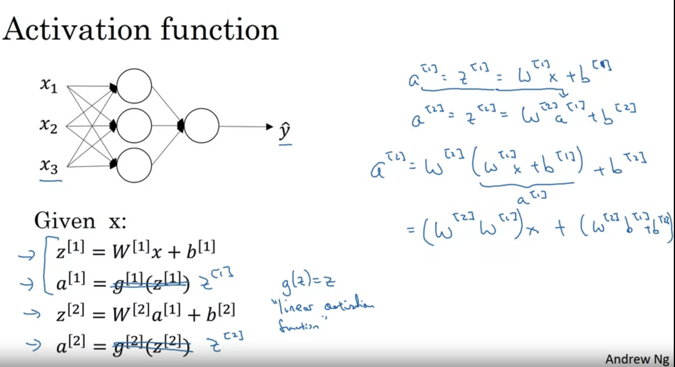 hidden layer, 즉 deep neural network이 의미없어진다. 여러 layer을 계산하든 한 layer을 계산하든 값이 똑같기 때문이다.
