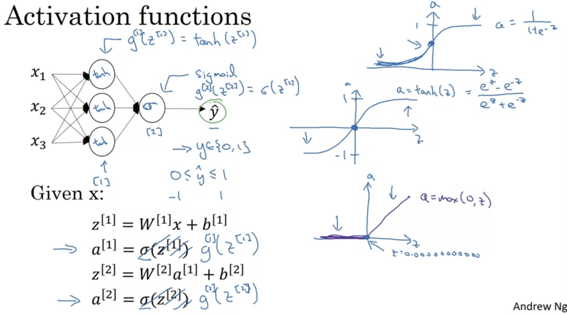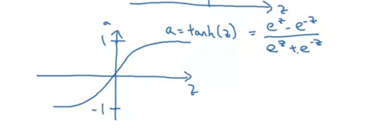 tanh 함수 : 시그모이드 함수 이동버전인데, 보통 시그모이드보다 항상 더 잘 작동한다고 한다. 왜냐하면 범위가 -1, 1이기 때문에 활성화의 평균이 0에 가깝기 때문이다. 따라서 데이터의 평균이 0.5가 아니라 0이 되도록 할 수 있다. 이렇게 하면 다음 레이어에 대한 학습이 더 쉬워진다고 한다. 더 자세한 얘기는 이후 second course에서 다룰 것이다.