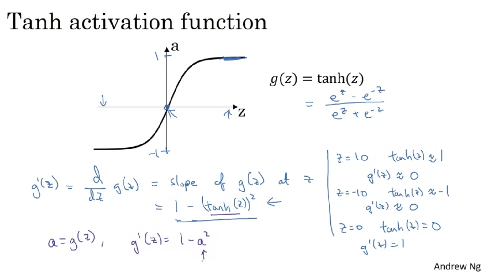 다음은 tanh(z)의 함수 및 기울기이며, z를 최대로 늘이거나 최소로 줄여보면서 확인해볼 수 있다.