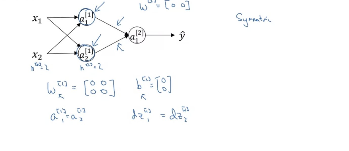 로지스틱 회귀의 경우, 가중치를 0으로 초기화해도 괜찮다. 그러나 neural network(신경망)에서 파라미터를 모두 0으로 초기화하고, 그래디언트 디센트를 적용하면 작동하지 않는다.