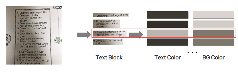 자연스러운 렌더링이 이루어지기 위해서는 글자 색상을 원본 이미지와 최대한 비슷하게 구현하는 것이 좋다고 판단이 들어, 글자 영역에 해당하는 최빈 색상을 통해 text color을 지정했다고 한다.