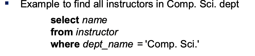 SQL은 비절차적 언어이다. 한개 이상의 테이블을 입력으로 받고, 항상 한개의 테이블을 리턴한다. 조건만 제시하고 세부적인 사항은 작성하지 않아도 된다. 다음은 SQL 사용 예시이다.