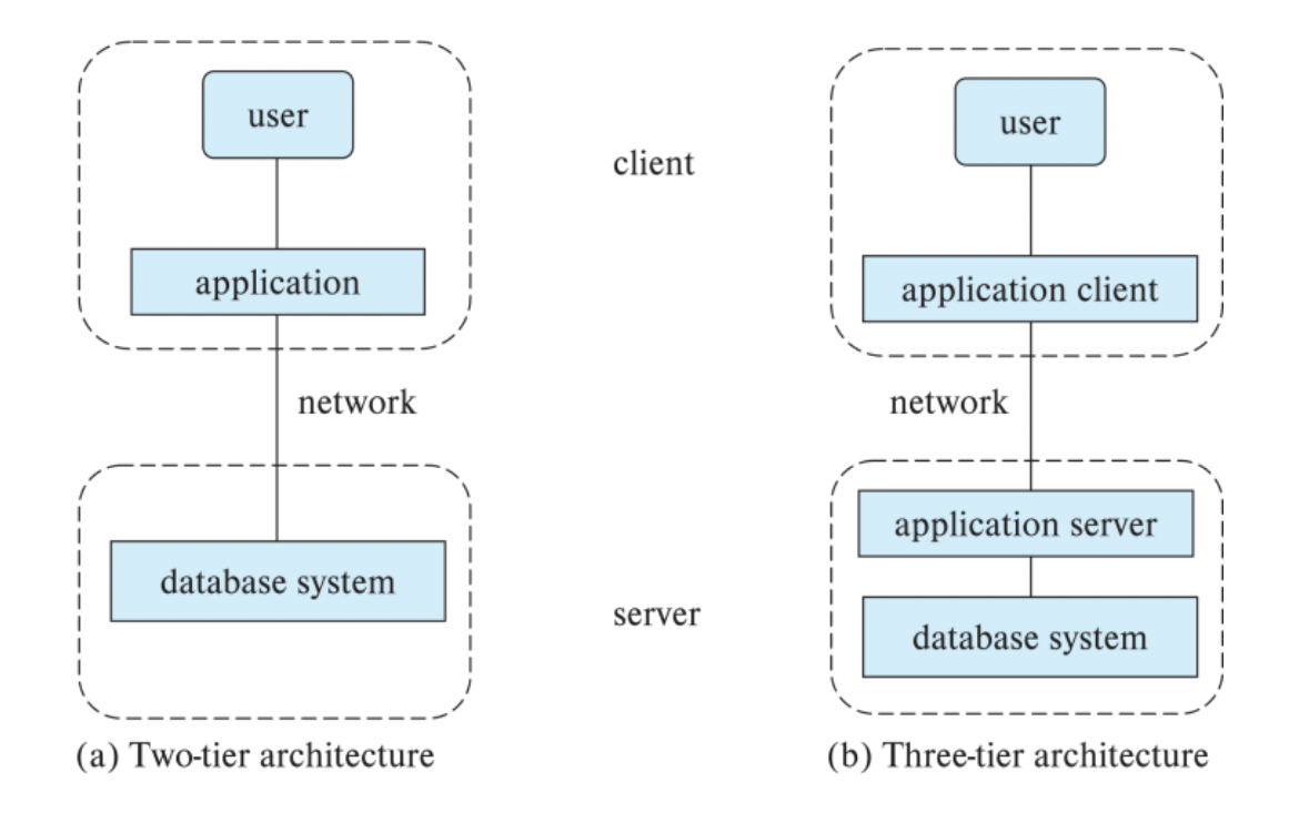 - two-tier architecture (2계층 구조) : 응용 프로그램이 클라이언트 상에 존재한다. 질의문을 보냄으로써 서버에 있는 데이터베이스 시스템의 기능을 불러온다.
